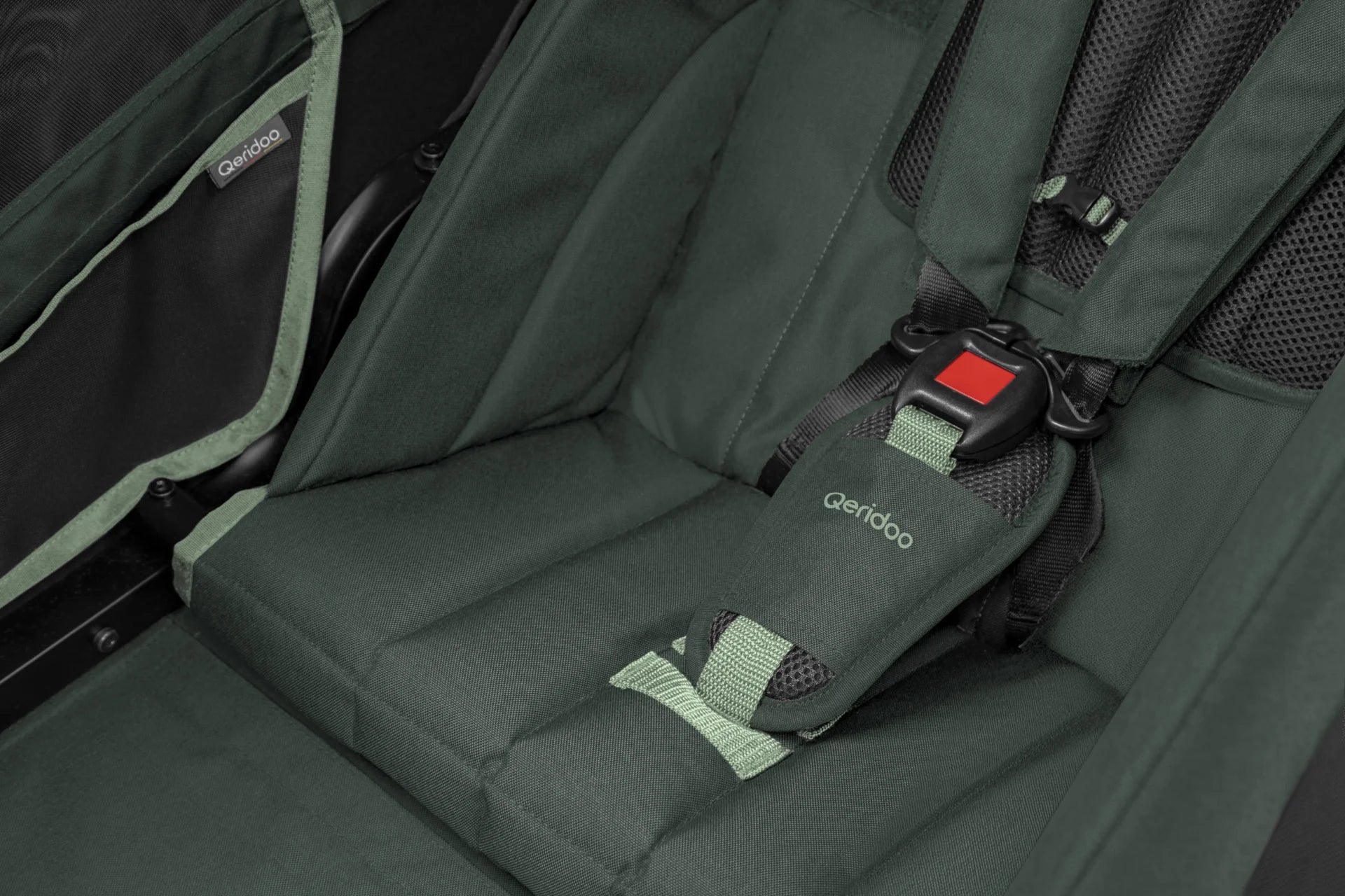 To ensure that your kids are securely seated in the buggy at all times and during every movement, a restraint system with 5-point safety belts is installed in every Qeridoo trailer. In addition, all bicycle trailers have rear impact protection, reflectors on the wheels, cover and hood and a reinforced aluminum frame with floor protection. The trailer's center of gravity is lowered for safe roadholding. The strollers are constructed in accordance with DIN EN 15918:2011 / EN1888-1:2018 and are tested for harmful substances.