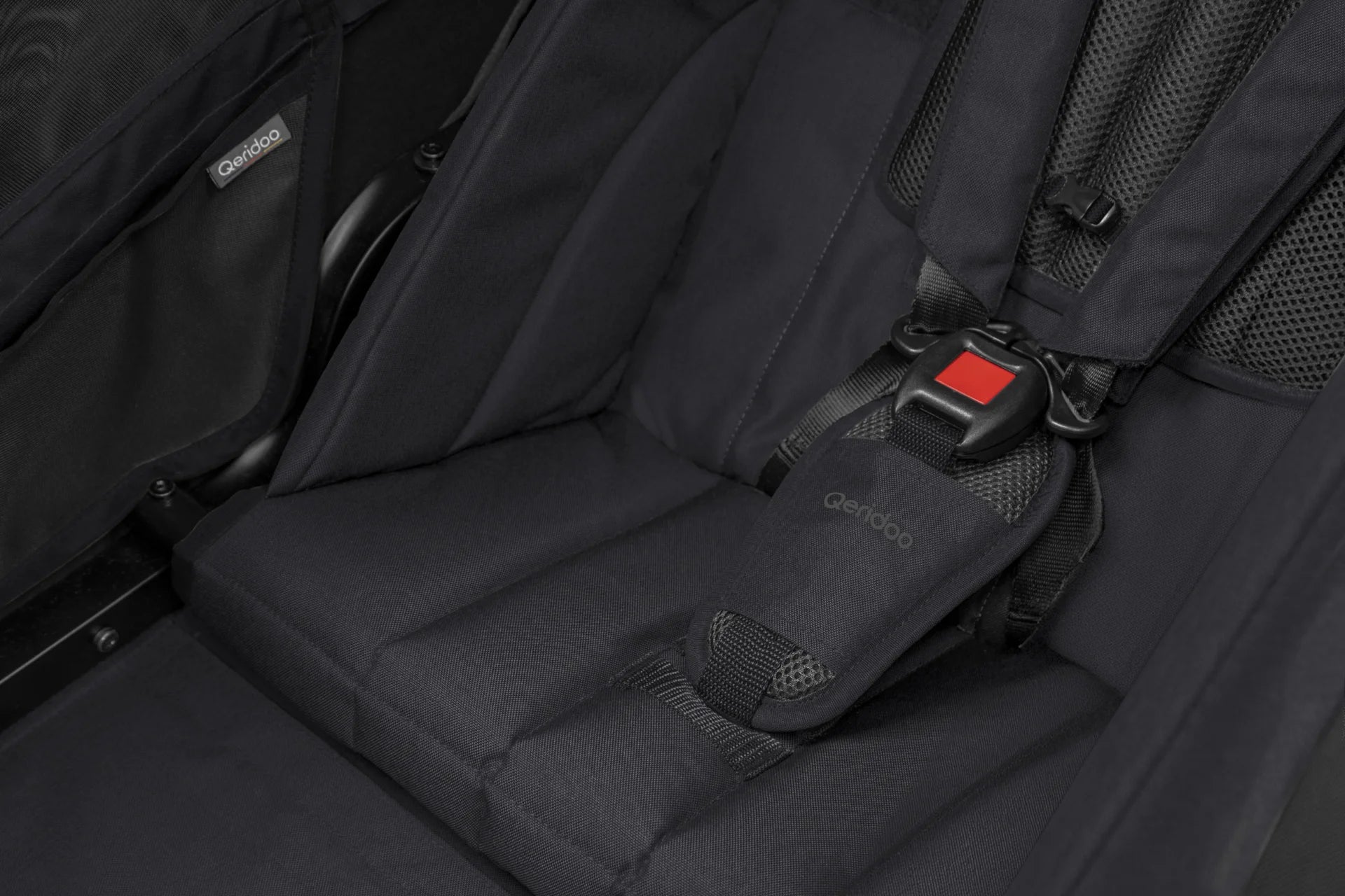 To ensure that your kids are securely seated in the buggy at all times and during every movement, a restraint system with 5-point safety belts is installed in every Qeridoo trailer. In addition, all bicycle trailers have rear impact protection, reflectors on the wheels, cover and hood and a reinforced aluminum frame with floor protection. The trailer's center of gravity is lowered for safe roadholding. The strollers are constructed in accordance with DIN EN 15918:2011 / EN1888-1:2018 and are tested for harmful substances.