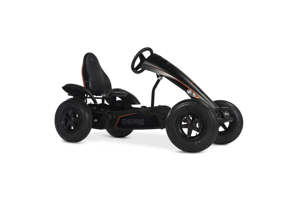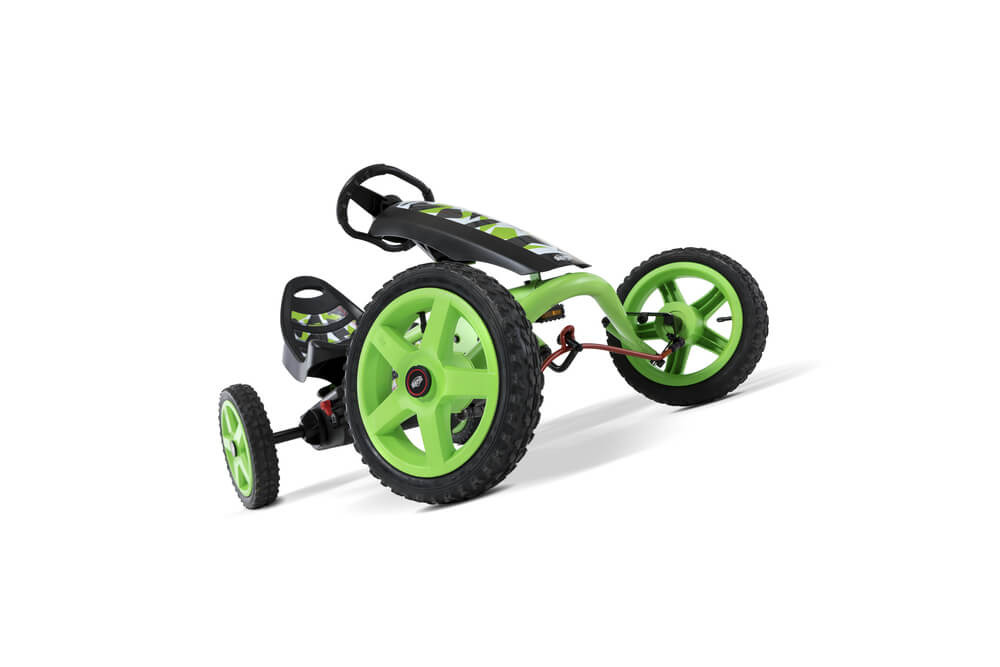 Die vier Räder bieten eine hervorragende Stabilität, die besonders wichtig für die “Race”-Serie ist. Die BFR-3 Pendelachse ist zusätzlich mit einer Dreigangschaltung ausgestattet, was das Gokartfahren noch einfacher gestaltet. Doch wer schnell fährt, der muss manchmal auch schnell bremsen: dafür sorgen die Rücktrittbremse sowie die Handbremse, mit der man das Gokart beim Parken vom Wegrollen hindern kann. Alternativ kann das schnittige Modell mit einem größeren Rahmen oder einem Elektromotor ausgerüstet werden.