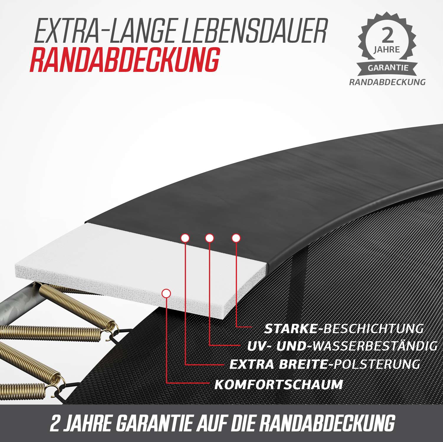 Mit seinem Deluxe Sicherheitsnetz und dem UV-beständigen Schutzrand bietet das Trampolin auf Füßen maximalen Schutz beim Hüpfen und Toben. Der 38 cm breite und 30 mm dicke Schutzrand fängt jeden Sprung sanft ab und verhindert ungewollte Verletzungen. Zusätzlich verfügt das Trampolin über eine CE-Kennzeichnung und ein TÜV-Siegel, die seine Sicherheit und Qualität bestätigen.Langlebige Freude in Grau oder Grün
