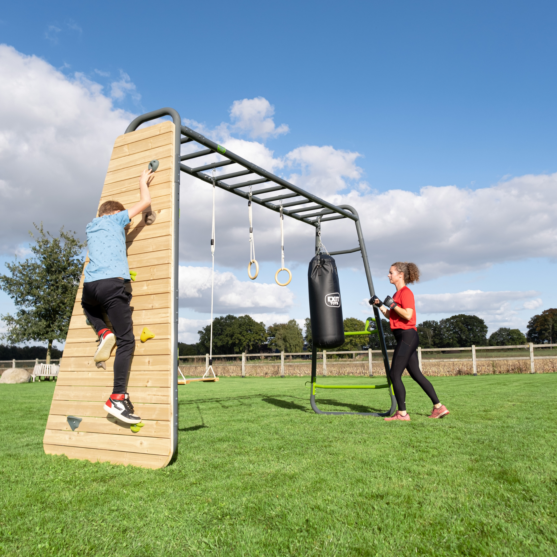 Die EXIT GetSet Monkeybar MB300 ist ein fast vier Meter langes Spiel- und Fitnessgerät für den Außenbereich, das dir maximale Freiheit bei der Zusammenstellung bietet. Das System wird ohne festes Zubehör geliefert, sodass du selbst entscheidest, wie du das GetSet MB300 ausstattest und nutzt – als Spielgerät für Kinder, als Trainingsstation für Erwachsene oder als Kombination aus beidem.