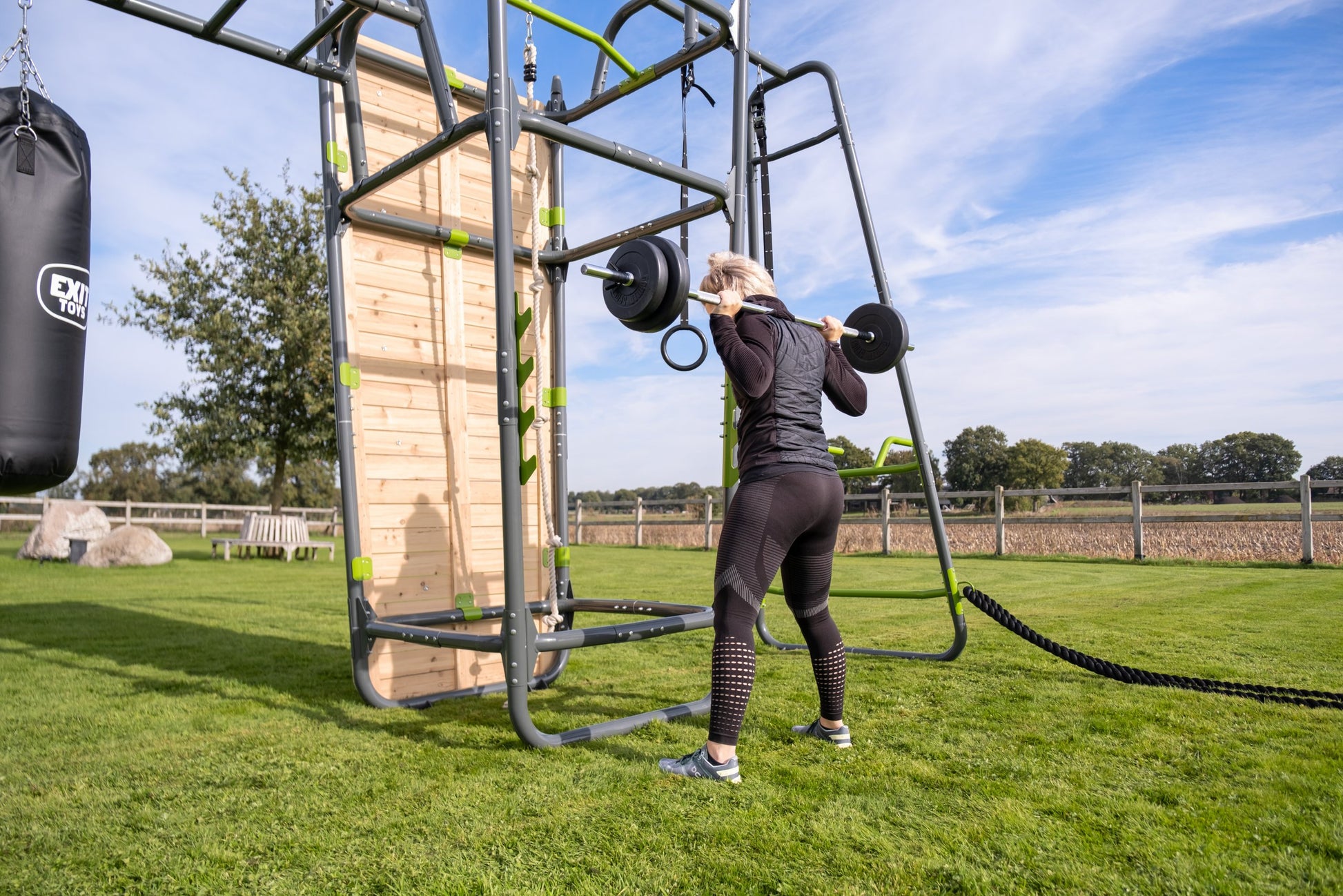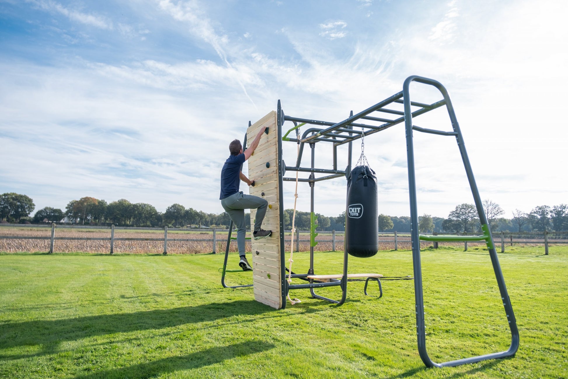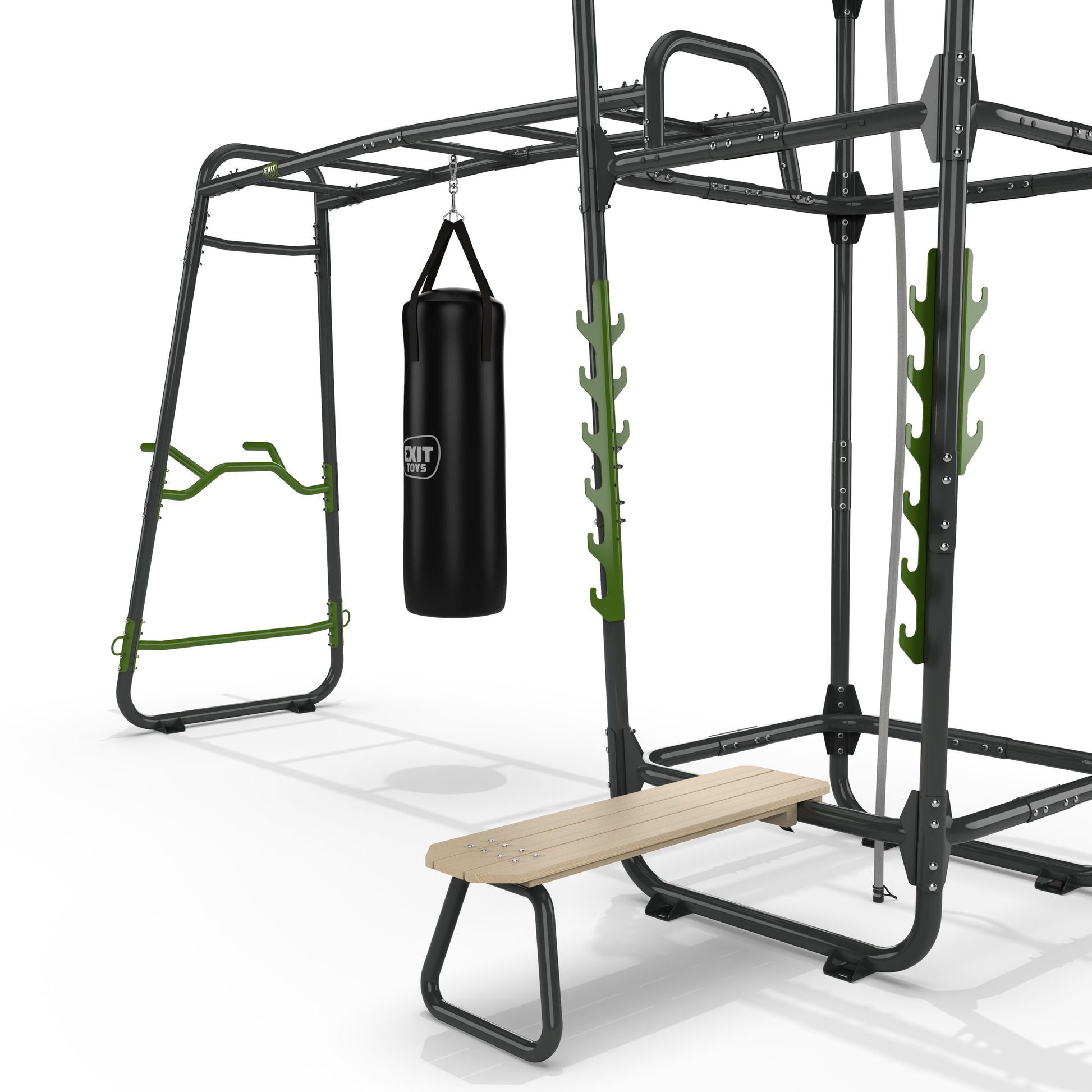 Das EXIT GetSet PS520 ist ein gut vier Meter langes Fitnessgerät für draußen. Folgendes Zubehör ist inbegriffen: Push-up-Stange, Dip Station, Battle Rope-Ringe, Boxsack, Trainingsbank, Hantelstützen, Pull-up-Stange, Kletterseil, Kletterwand und Griffe. Diese Powerstation ist multifunktional einsetzbar und bietet viele Herausforderungen für Erwachsene und sportliche Teenager ab 14. Hol dir mit dem GetSet PS520 das Fitnessstudio ins Haus!Outdoor-Fitness im eigenen Garten