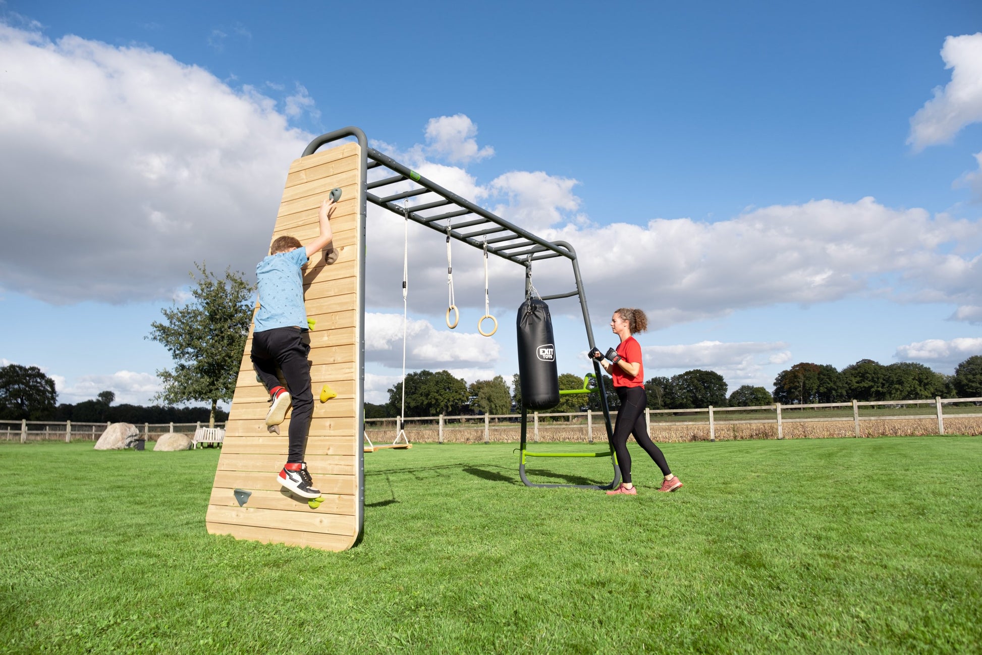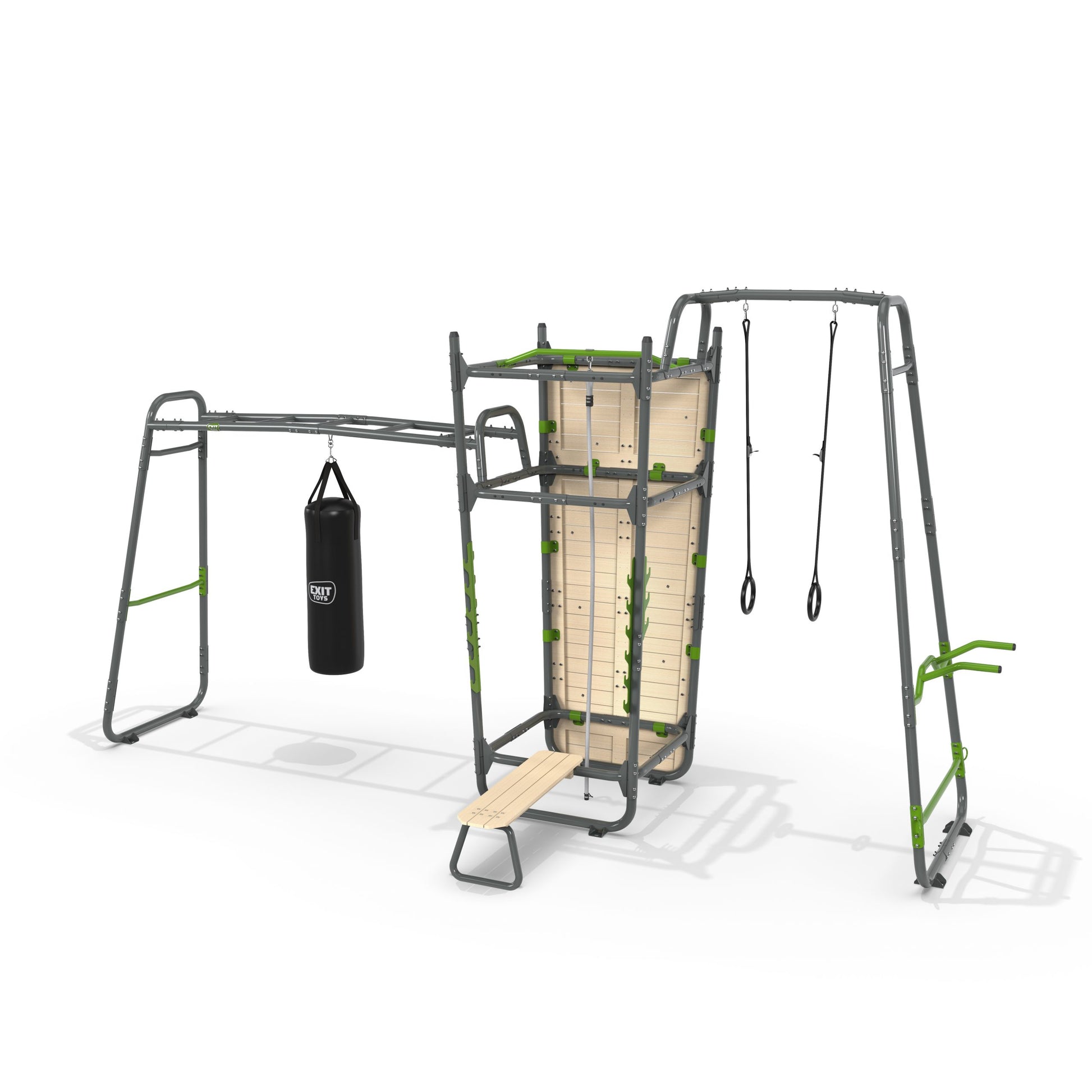 Das EXIT GetSet PS620 ist ein gut sechs Meter langes Fitnessgerät für draußen. Folgendes Zubehör ist inbegriffen: Reckstange, Boxsack, Trainingsbank, Hantelstützen, Pull-up-Stange, Kletterseil, Turnringe aus Kunststoff, Push-up-Stange, Dip Station, Battle Rope-Ringe, Kletterwand und Griffe. Diese besonders umfassende Ausführung ist multifunktional einsetzbar und bietet viele Herausforderungen für Erwachsene und sportliche Teenager ab 14. Hol dir mit dem GetSet PS620 das Fitnessstudio ins Haus!Outdoor-Fitness im eigenen Garten