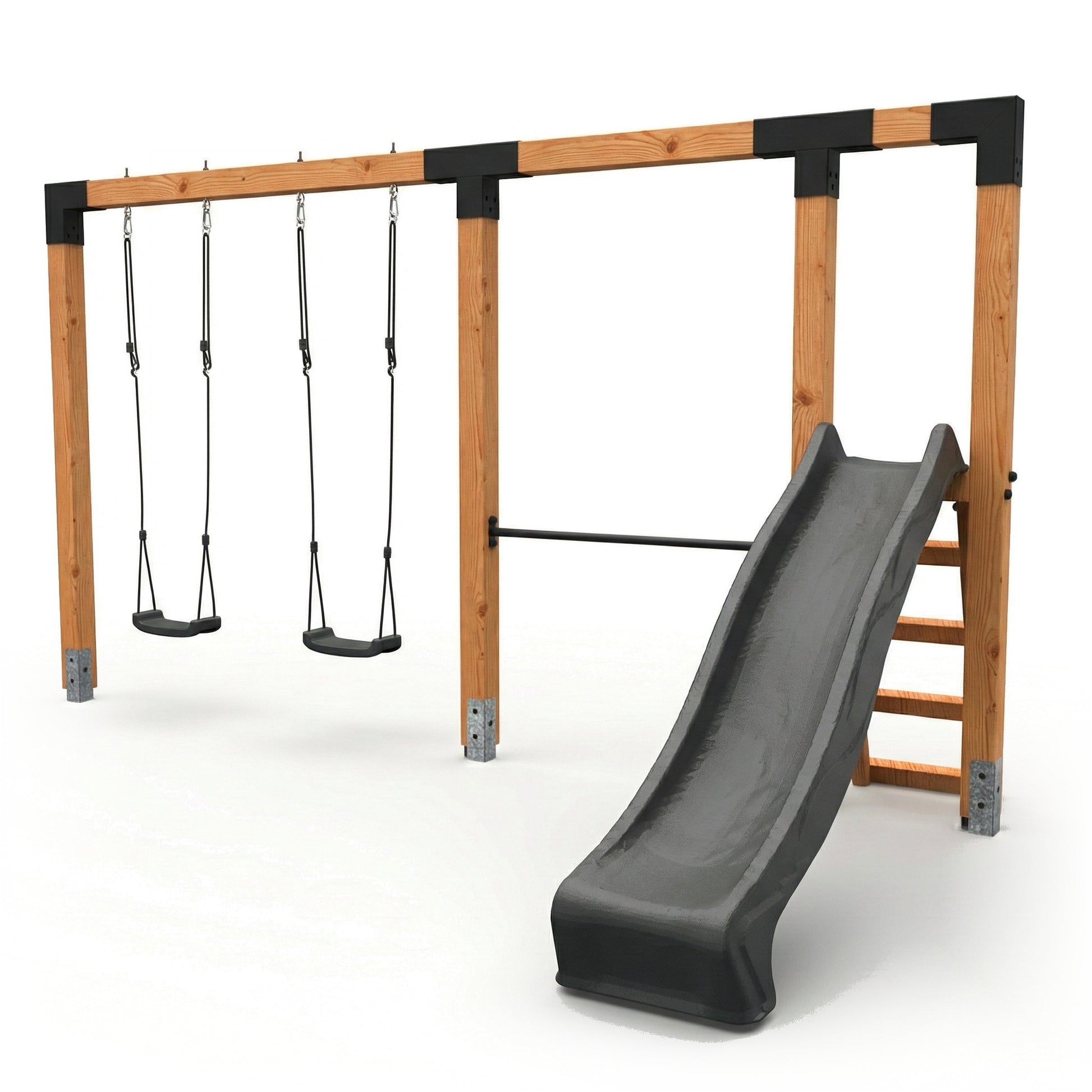 Zwei Schaukelsitze, eine 125 cm breite Reckstange und eine Rutsche in modernem Anthrazit sorgen für abwechslungsreiche Bewegung und fördern Kraft, Koordination und Gleichgewicht.