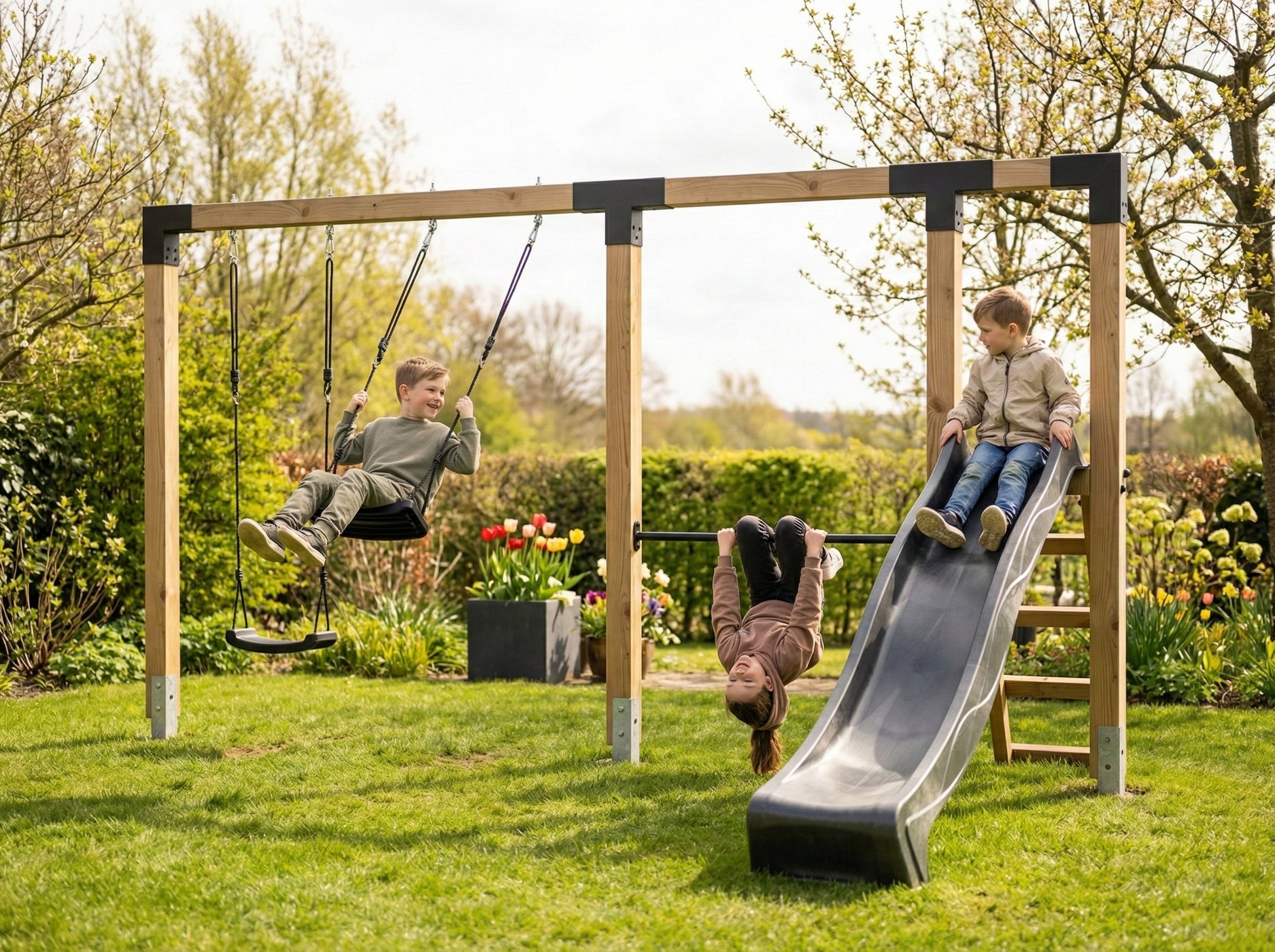 Mit dieser Kombination aus Doppelschaukel, Reckstange und Rutsche entsteht eine vielseitige Spielanlage für den eigenen Garten. Ideal für Familien und aktive Kinder, die sich täglich austoben und neue Spielideen entdecken möchten.