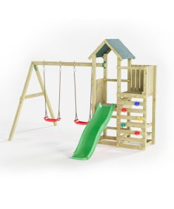 Der Mini Spielplatz Chester bietet gleich mehrfachen Spielspaß: Neben der 175 cm langen grünen Rutsche können gleich zwei Schaukeln am Schaukelbalken befestigt werden. Über die Holzleiter gelangen deine Kinder auf die 70 x 130 cm große Plattform, die sich auf einer Höhe von etwa 90 cm befindet, und können von dort aus wieder herunterrutschen. Über die Kletterwand mit den Klettersteinen geht es noch eine Etage höher auf die ca. 125 cm hohe Plattform. Ob Klettern, Rutschen oder einfach nur die Aussicht genießen – der Spielturm Chester ist ein vielseitiges Spielgerät für Kinder. Neben seinem ansprechenden Design punktet der Spielturm auch mit seiner einfachen Montage. Der Lieferumfang umfasst einen vollständigen Bausatz aus Nadelholz, Bodenanker, Holzleiter, Rutsche, Schaukelbalken sowie zwei Schaukelsitzen, einer Kletterwand inkl. Klettersteine und weiteres Montagewerkzeug. Die bebilderte Schritt-für-Schritt-Montageanleitung macht den Aufbau kinderleicht.Die natürlichen Holzeigenschaften des Spieleturms