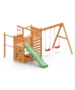Entdecke die vielfältigen Möglichkeiten des Spielturms Climbing Star 3! Das Kinderspielhaus steht auf robusten Holzstelzen und ist mit spielerischen Ergänzungen ausgestattet. Mit gleich zwei Podesten geht es beim Spielen hoch hinaus. Das erste Podest befindet sich auf einer Höhe von 150 cm, das zweite Podest auf einer Höhe von 120 cm. Die Plattformen bieten mit einer Größe von 90x80 cm bzw. 90x93 cm ausreichend Platz für mehrere Kinder. Ob Klettern, Toben, Rutschen oder einfach nur die Aussicht genießen – der Spielplatz Climbing Star 3 ist ein vielseitiges Spielgerät für Kinder. Über die Holzleiter, Strickleiter oder das Kletternetz gelangen deine Kinder auf die Plattformen. Über die grüne Rutsche mit einer Länge von 220 cm können sie wieder herunterrutschen. Von der ersten Plattform aus geht es mit einem Schritt auf das kleinere Podest, das über eine Kletterwand mit Klettersteinen erreichbar ist. Die inkludierten gelben Griffe sorgen dafür, dass dein Kind beim Klettern nicht den Halt verliert. Direkt unter der Plattform befindet sich ein integrierter Sandkasten mit einem Brett als Sitzgelegenheit. Nebenan befindet sich die Gymnastikstange, an der die kleinen Kletteraffen Vorwärtsrollen oder andere gymnastische Übungen machen können. Anschließend an das Klettergerüst wird der Schaukelbalken angebracht, der Platz für direkt zwei Schaukeln bietet. Auf der roten Doppelschaukel können deine Kinder hervorragend in die Luft schwingen. Neben seinem ansprechenden Design punktet das Spielhaus auch mit seiner einfachen Montage. Der Lieferumfang umfasst einen vollständigen Bausatz aus Nadelholz, Bodenanker, Sprossenleiter, Kletternetz, Kletterseil, Griffen, Kletterwand inkl. Klettersteine, Gymnastikstange, Schaukelbalken inkl. 2 Schaukelsitzen, Sandkasten und weiteres Montagewerkzeug. Die bebilderte Schritt-für-Schritt-Montageanleitung macht den Aufbau kinderleicht.Pflegehinweise für langanhaltende Freude