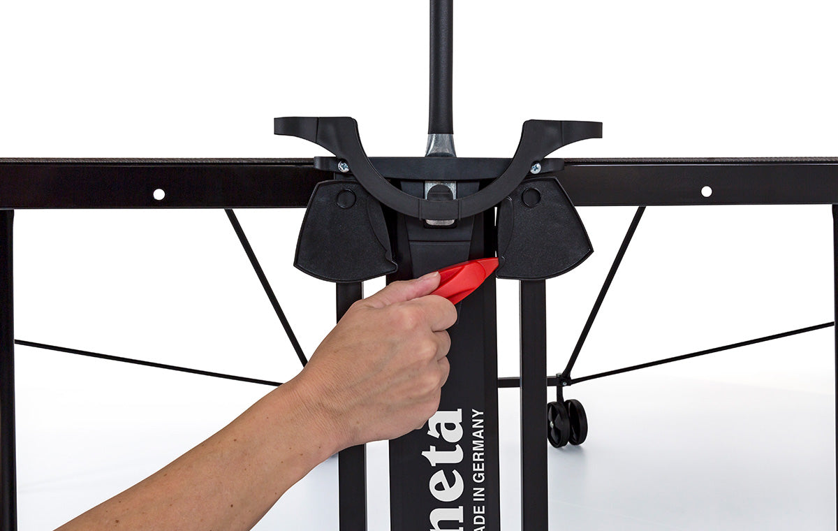 - Drehgriff-System mit Einrastmechanismus beim Zusammenklappen des Tisches in Abstellposition
